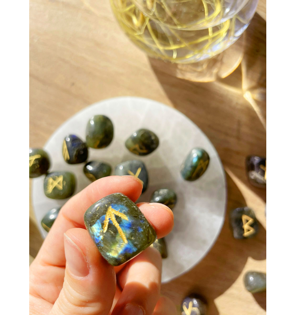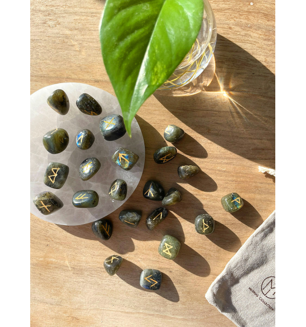 24+1 rodados de Labradorita con runa grabada en dorado, de unos 2-3cm aprox. Incluye bolsita de lino de Mukhas.