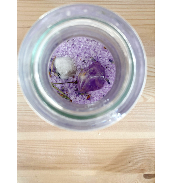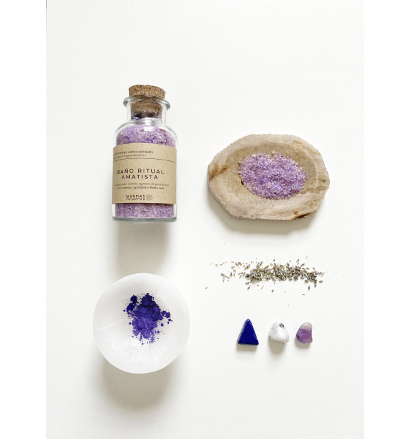 BAÑO RITUAL DE AMATISTA: Con sal del Himalaya, aceites esenciales puros, aceite de jojoba, flores de lavanda, y pigmento lila de Gema de Mica.