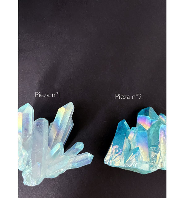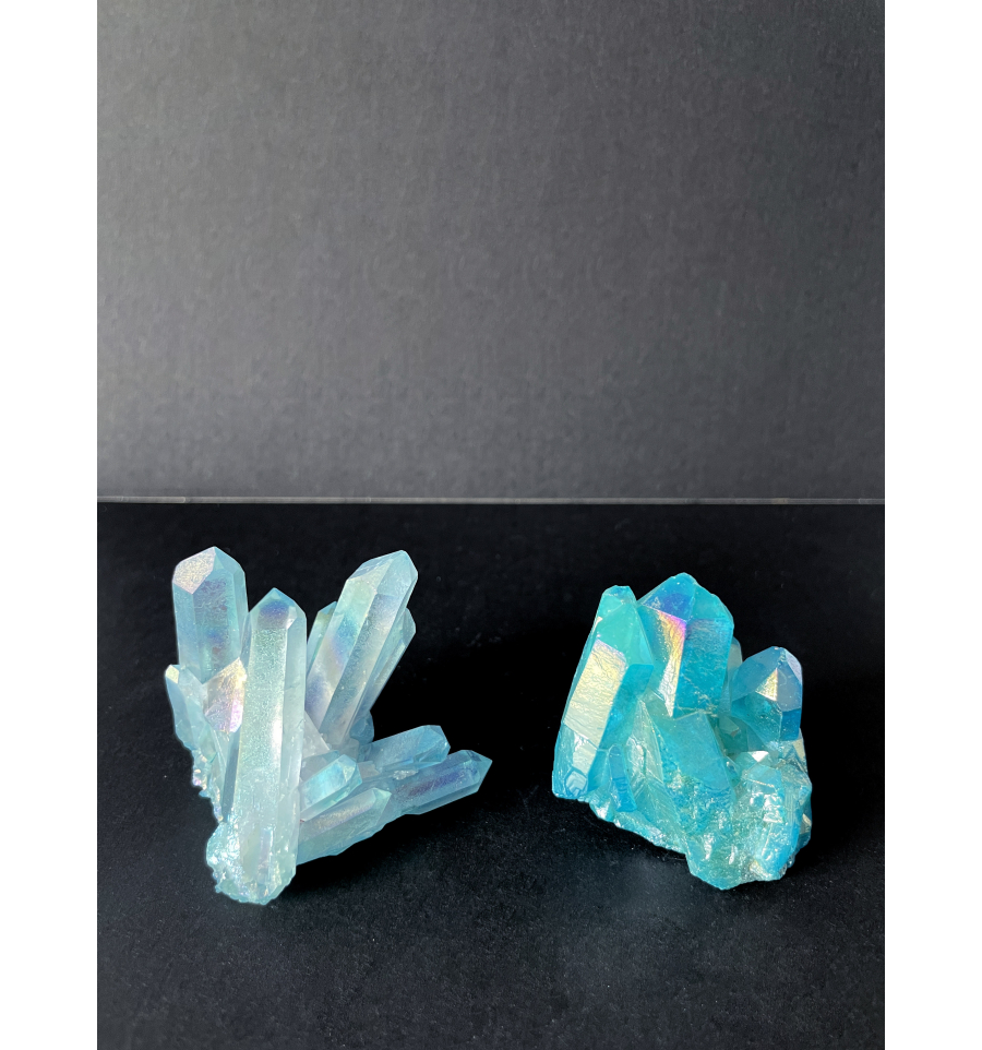 Son el resultado de la combinación entre naturaleza y metales preciosos como el Oro, Plata, Platino, Titanio, Cobalto... creando una capa de color arcoíris. Este proceso alquímico intensifica la vibración de la punta del Cuarzo natural de alta pureza, ideal por ello para meditación, cuartos infantiles, y espacios de creatividad.