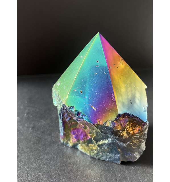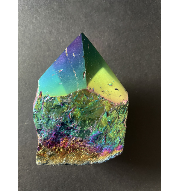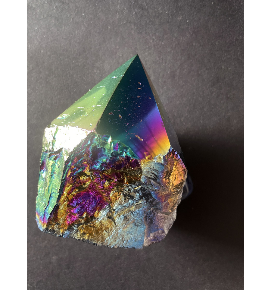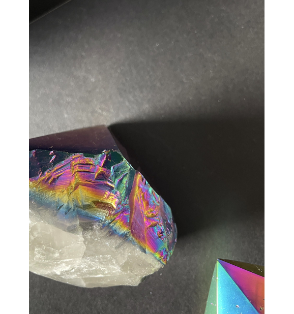 Son el resultado de la combinación entre naturaleza y metales preciosos como el Oro, Plata, Platino, Titanio, Cobalto... creando una capa de color arcoíris. Este proceso alquímico intensifica la vibración de la punta del Cuarzo natural de alta pureza, ideal por ello para meditación, cuartos infantiles, y espacios de creatividad.