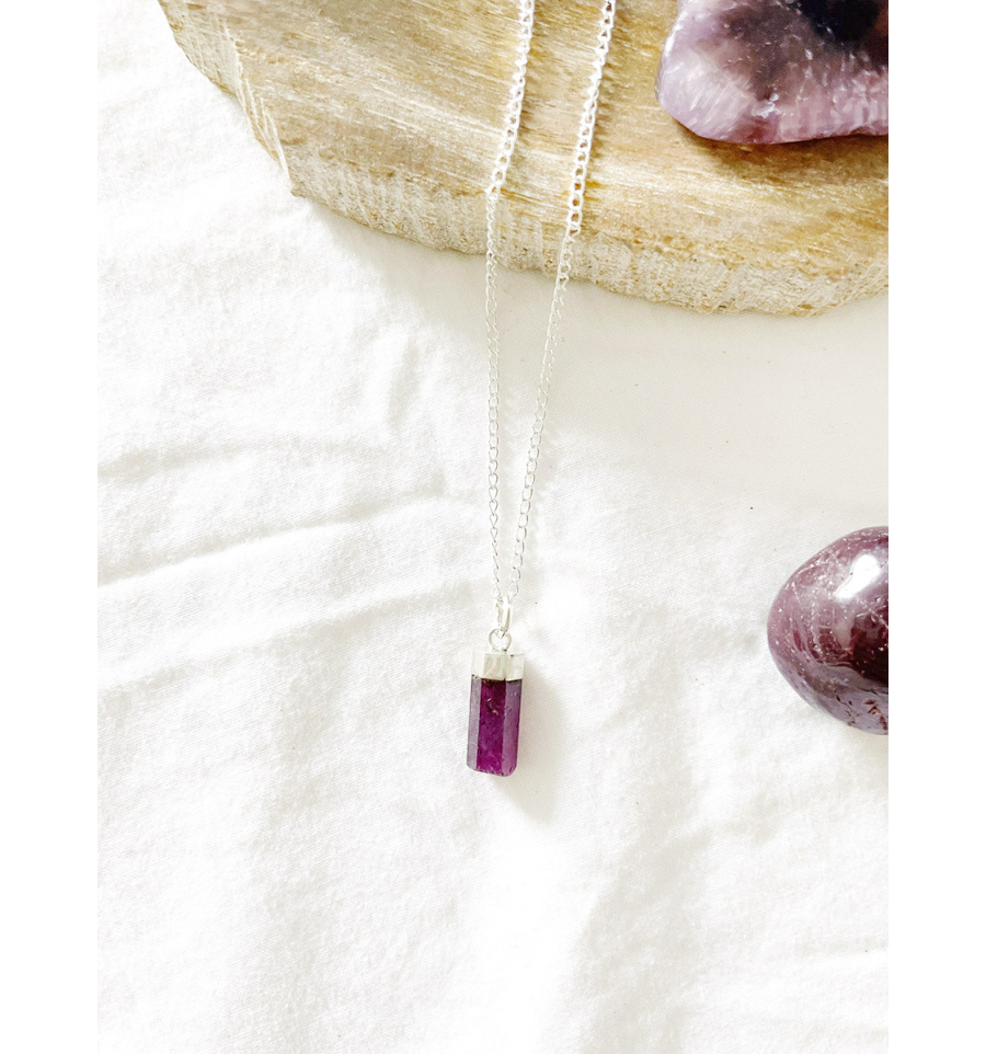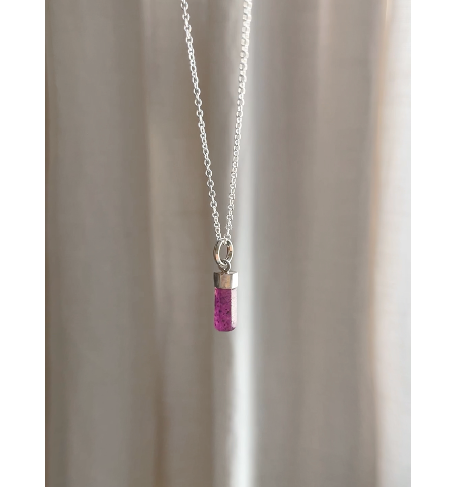 Cada joya está hecha a mano y es única. La vara de Rubí es natural y está sin pulir, por lo que presenta inclusiones e irregularidades propias de piezas sin tratar.