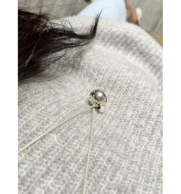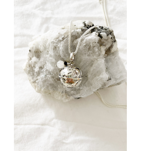 Colgante en Plata 925 (libre de níquel, cadmio y plomo). Motivos tallados de estrellas y lunas de 22mm, cuenta de Piedra Luna de 6mm, y de Ónix facetada de 2mm.