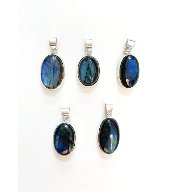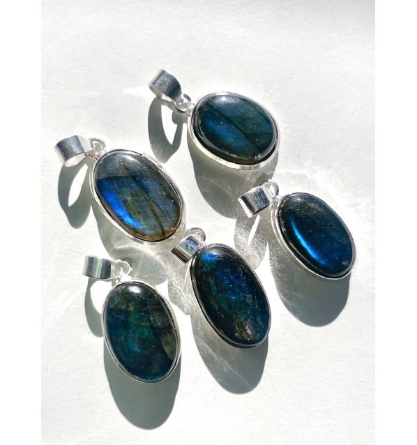 Piezas pulidas de patrones espectaculares azulados intensos de labradorescencia, tesoros típicos de la zona de Madagascar. Una Gema mística que potencia la intuición y protege el aura. Es conocida por abrir puertas a planos espirituales, estimular la creatividad y fortalecer la conexión con la propia energía interior y cósmica.